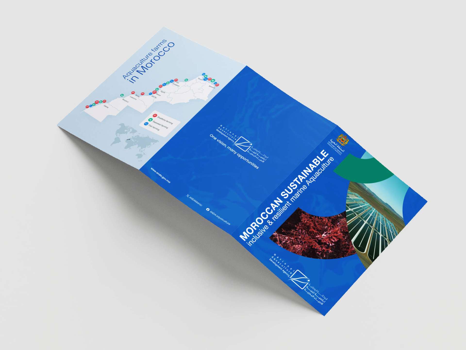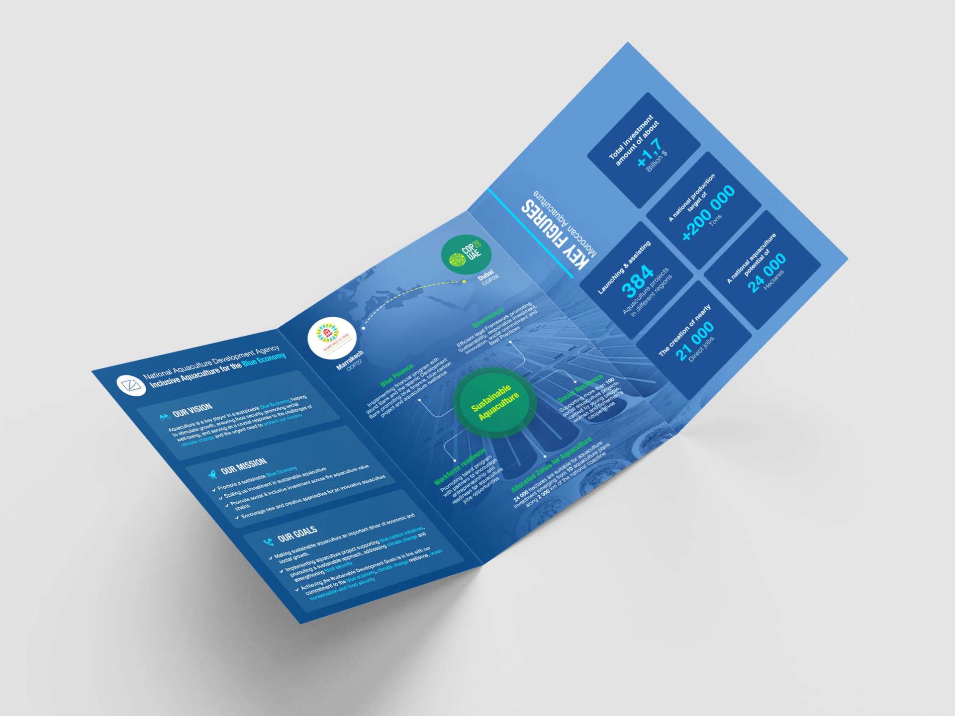 To attract attention and quickly inform through an A4 programme and an A5 flyer, while showcasing Morocco’s leadership in the blue economy and positioning sustainable and inclusive aquaculture as a strategic lever for economic, social, and environmental development, in line with SDG 14, within the framework of COP28.